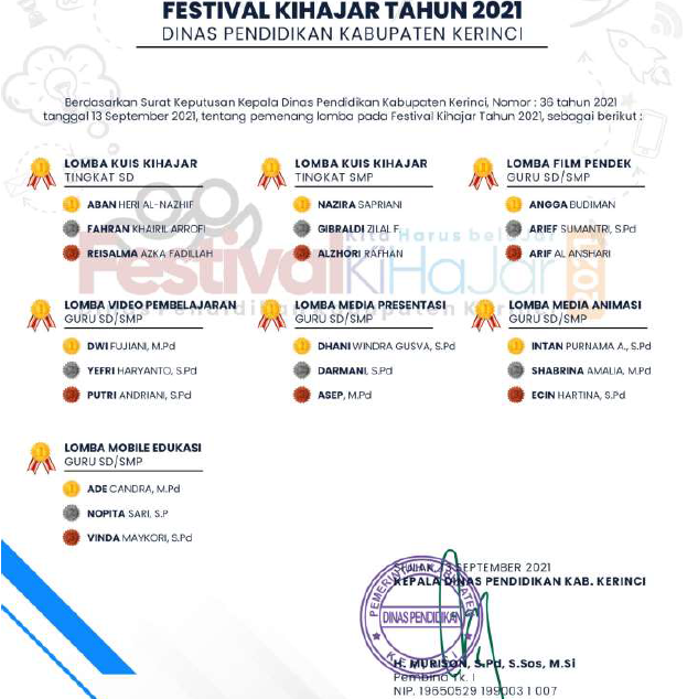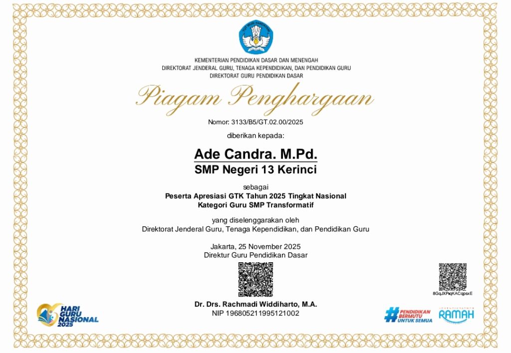Juara 1 Guru SMP Berprestasi Tingkat Kabupaten Kerinci tahun 2022