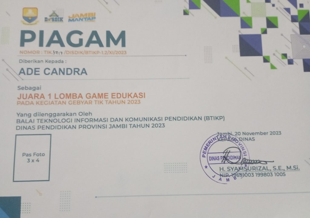 Juara 1 Gebyar TIK tingkat Provinsi Jambi Kategori Membuat Game Edukasi Tahun 2023