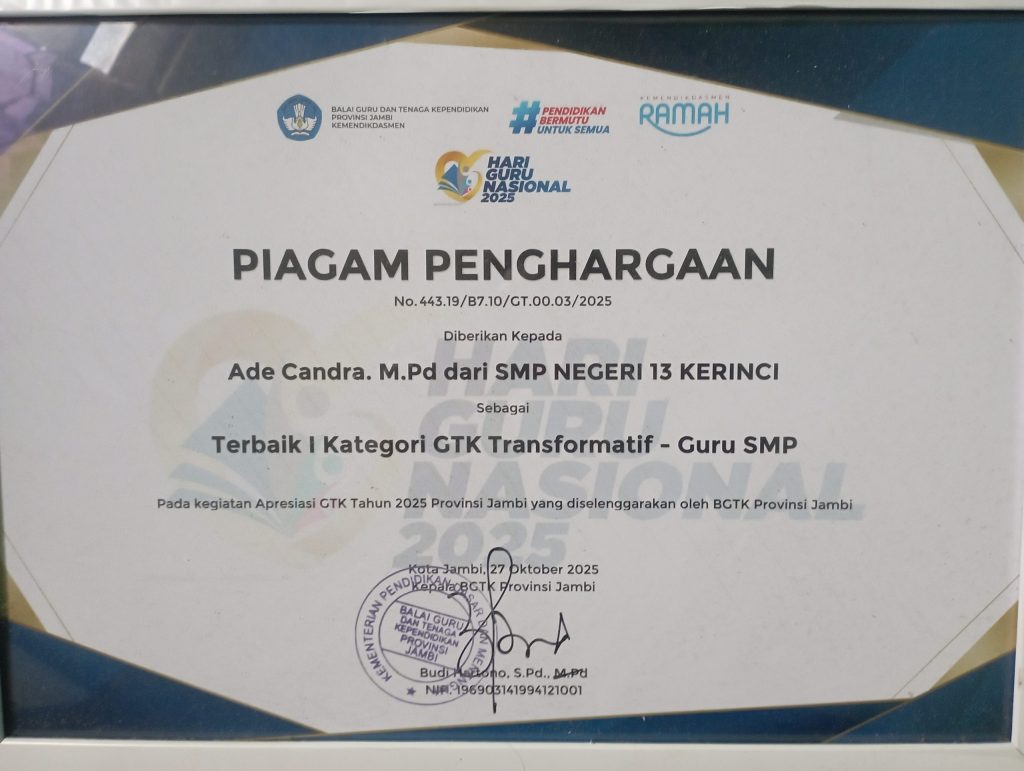 Juara 1 GTK Inovatif Guru SMP tingkat Provinsi Jambi Apresiasi GTK tahun 2023